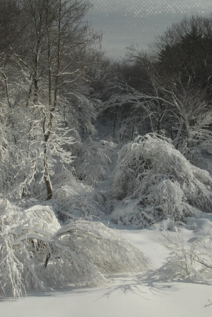 I took this photo out of my upstairs window. It’s through the screen for two reasons. First, I don’t trust Piper. He’s liable to launch himself into a pile of pristine snow, yelling “Wheee” the whole way down. And second, I like the inside/outside juxtaposition. I can’t get this view without being in the cocoon of our little house and I’m perfectly content staying right here. And when spring comes, just look for me in the trees.